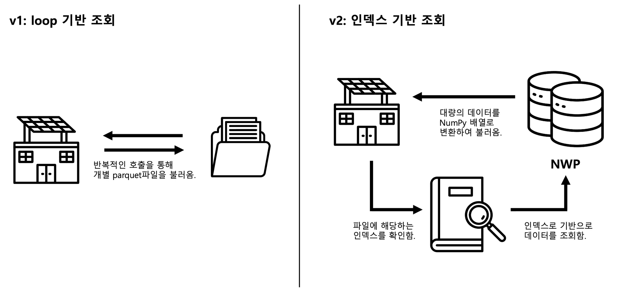 저수준 API를 통해 엄청난 속도의 발전을 이루었지만, 데이터 I/O에서의 문제가 남아있었습니다. 기존 v1 방식은 각 발전소 루프마다 필요한 기상예보데이터(NWP; Numerical Weather Prediction)를 개별 Parquet 파일에서 읽어왔습니다. 15만 개의 발전소가 10개의 Task로 나뉘어져 있어도, 각 Task 내에서는 1.5만 번의 파일 접근을 시도하여, 엄청난 I/O 병목을 유발하였습니다. 쉽게 설명하자면 택배로 보낼 물품 1.5만개를 한 대의 오토바이 퀵서비스로 반복적으로 보내고 받는 것과 다르지 않습니다. v2방식은 1) 인덱스 기반 조회와 2) 대량 데이터 전송(예: fetch_df_all()) 방식을 통해 택배차 한 대가 1000개의 택배를 한꺼번에 운송하는 방식과 비슷하게 문제를 해결했습니다.