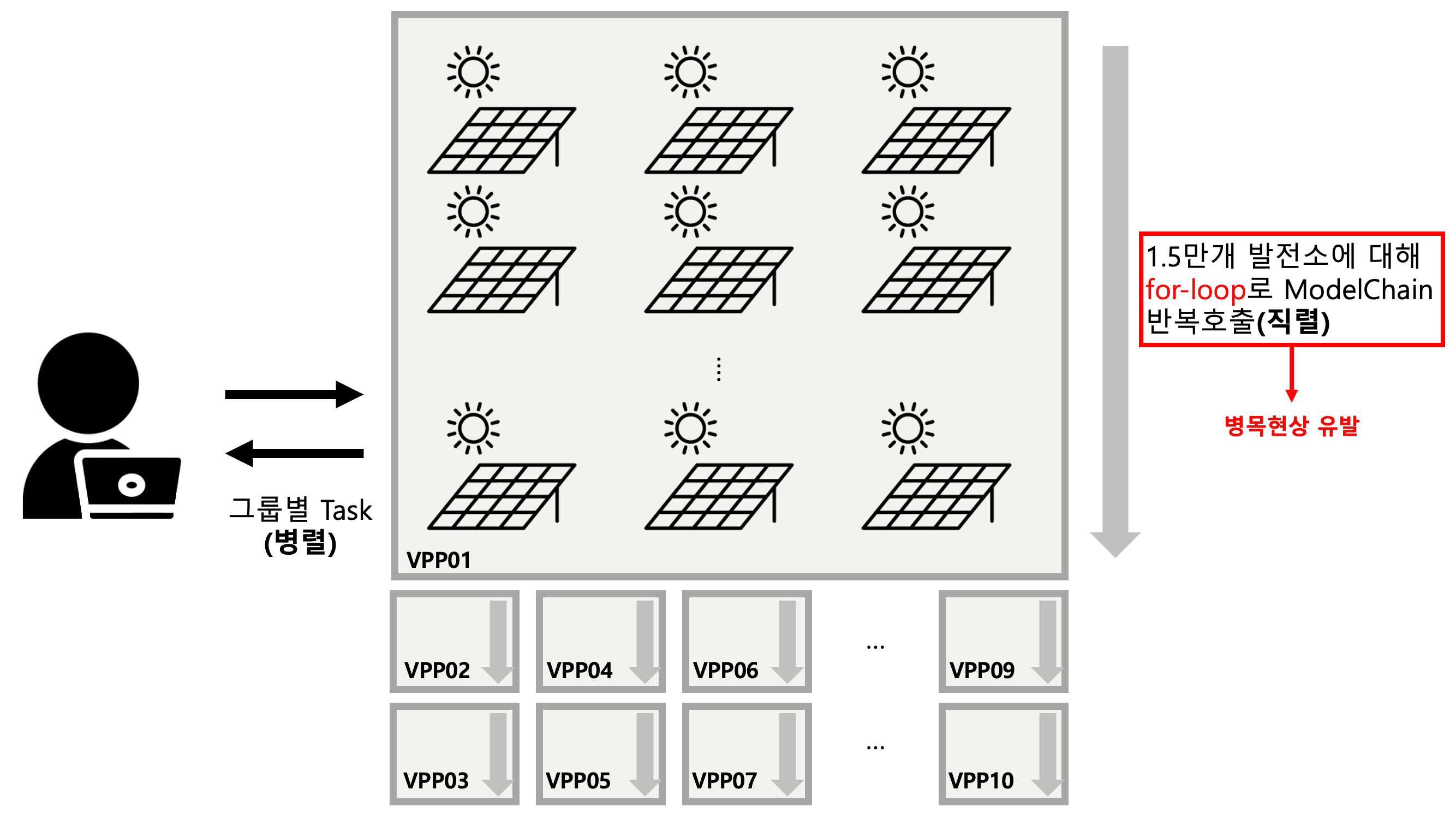 먼저 15만개의 발전소들을 10개의 그룹으로 만들어 각 그룹별로 Task가 병렬로 이루어지도록 합니다. 각 그룹 내에서는 1.5만개 발전소를 for-loop로 순회하며 직렬 형태로 ModelChain을 반복호출하게 됩니다. 즉, 병렬처럼 보여도 실상은 루프의 반복이 전체 시간을 지배했습니다. 위 아키텍쳐에서 병목 현상을 유발한 요인은 다음과 같이 정리할 수 있습니다.