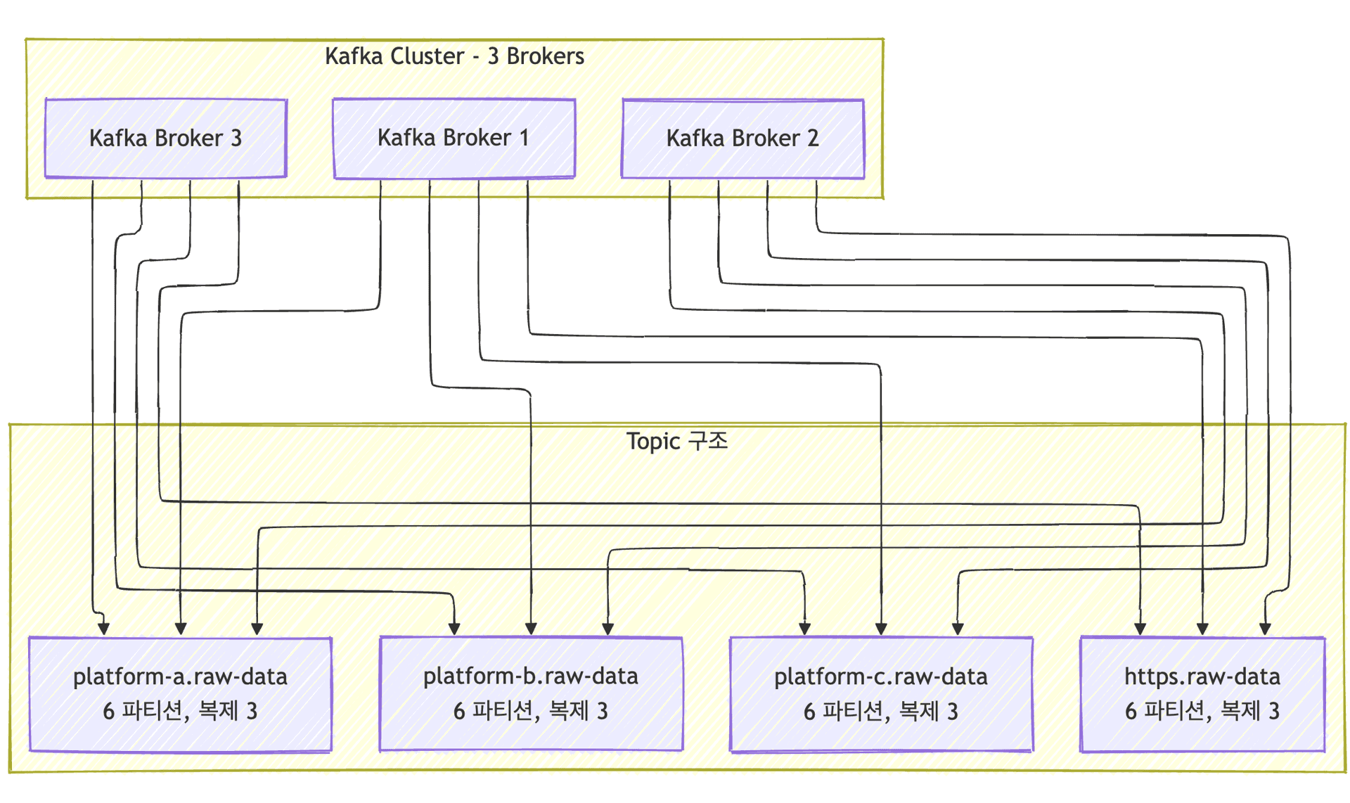 Topic design was carefully planned. Topics were separated by protocol (IoT Platform A, B, C, HTTPS) to allow independent management according to each channel’s characteristics. Each topic consisted of six partitions for parallel processing, and a replication factor of three ensured data safety in case of broker failures. Messages were retained for seven days, providing sufficient recovery time in the event of unexpected issues.