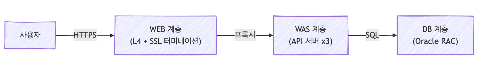 The web service is built on a typical 3-tier architecture. The front-end WEB layer handles static resource serving and SSL/TLS termination, and load balances across two servers via L4 switches. Incoming requests are proxied to the WAS servers.