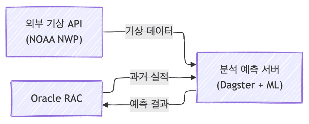 The forecasting server uses Dagster-based workflow orchestration. Dagster manages the scheduling and execution of the data pipeline, integrating data collection, preprocessing, and forecast execution into a single workflow. Pipeline execution history and dependencies are systematically managed.